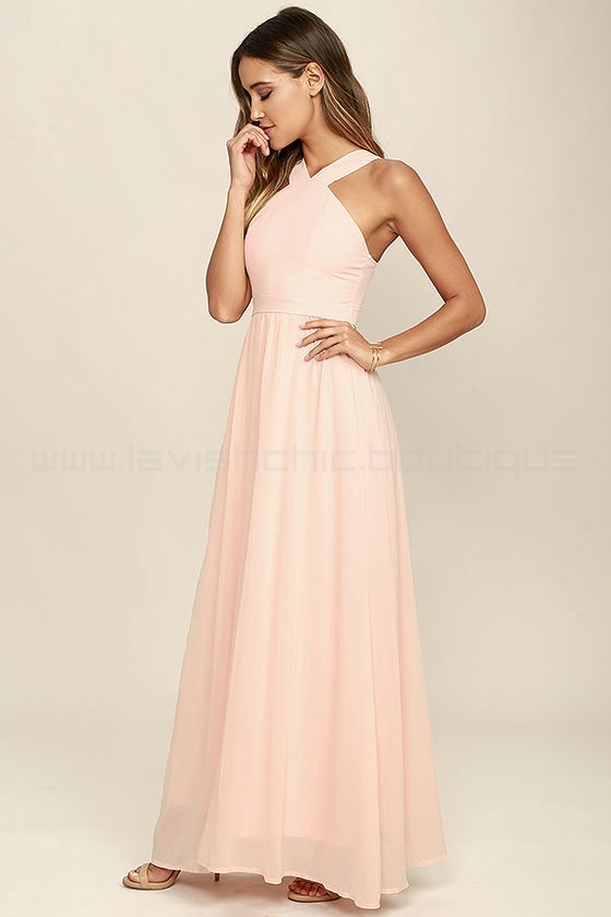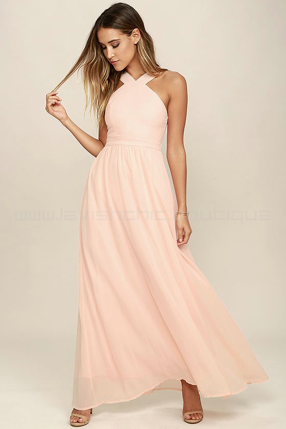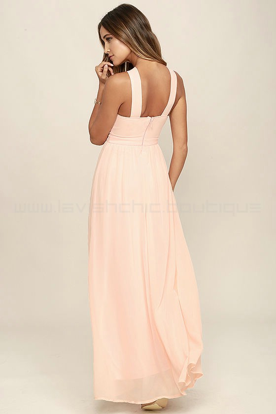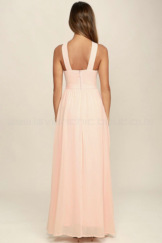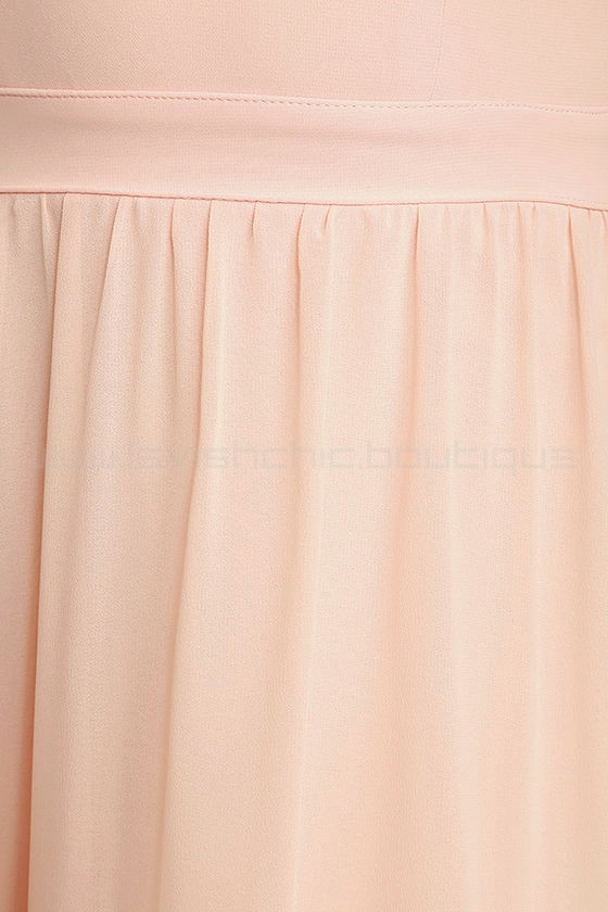 More romantic than a candlelit dinner or a trip to the Eiffel Tower, the Air of Romance Peach Maxi Dress will have you feeling the love! Lightweight Georgette falls from a modified halter neckline, into a seamed bodice supported by semi-sheer shoulder straps. A sweeping skirt cascades from a banded waist completing this elegant maxi dress. Hidden zipper with clasp.