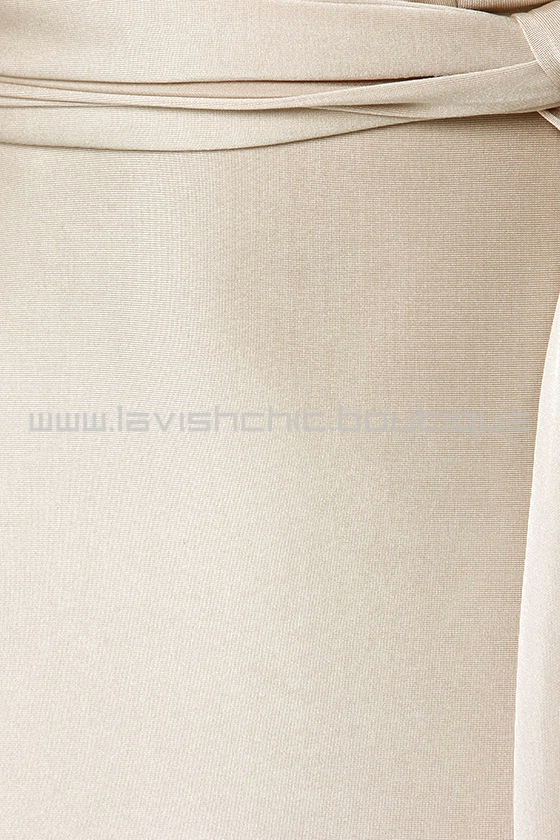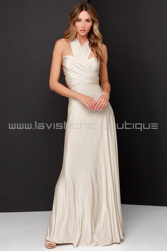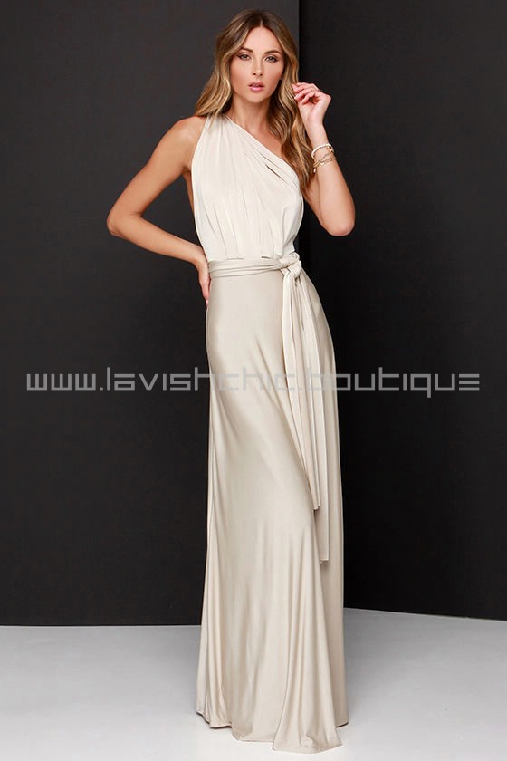 Any which way you wrap it, the Always Stunning Convertible Beige Maxi Dress is one amazing dress! Two, 82" long lengths of fabric sprout from an elastic waistband and wrap into dozens of possible bodice styles including halter, one-shoulder, cross-front, strapless, and more. Stretchy beige fabric has a satiny sheen, and a full length maxi skirt pairs perfectly with any choice you make up top. Unlined.