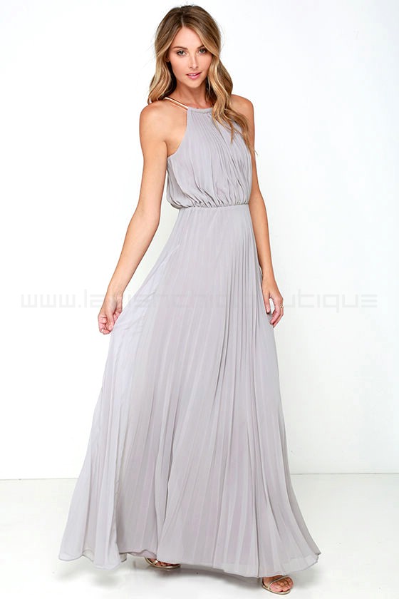 From the first dance to the last, everything will be an utter dream in the Bariano Melissa Light Grey Maxi Dress! A stretchy gold coil necklace (with adjustable lobster clasp closure) creates a sultry halter neckline supporting pleated Light Grey chiffon. Sleeveless bodice billows into an elastic waistband before descending into an unforgettable maxi length skirt. Triangular back keyhole.