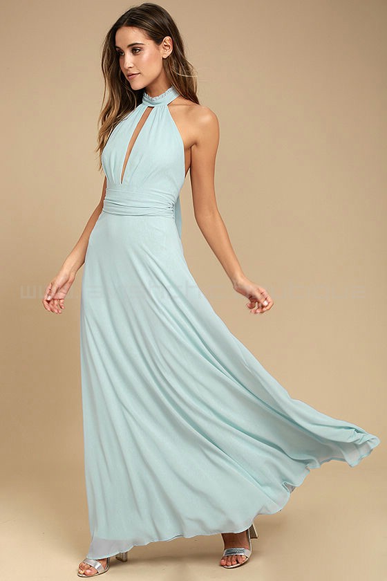 Endless romance always follows an appearance of the First Comes Love Light Blue Maxi Dress! Woven poly sweeps from a ruffled, halter neckline into a backless bodice with pleated detail and a keyhole cutout. Tying sash wraps around the waist above a cascading maxi skirt. Hidden back zipper/clasp.
