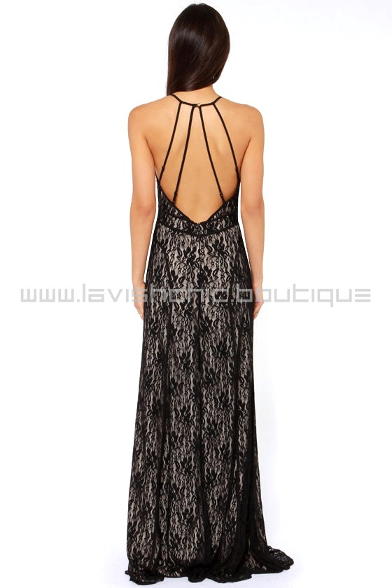 As Seen On Emily of Stiletto Beats blog! Say hello to Another Late Night Backless Black Lace Maxi Dress and goodbye to curfews and boring nights at home! A small cutout brings a sultry touch to the darted bodice of this stretch knit dress below the halter neckline. Four adjustable spaghetti straps decorate the open back, and attach to the halter near a gold button closure. Beautiful floral lace and accent seams cover the bodice, fitted waist, and the floor length maxi skirt with its captivating mermaid hem. Hidden back zipper/clasp closure. Dress is fully lined.