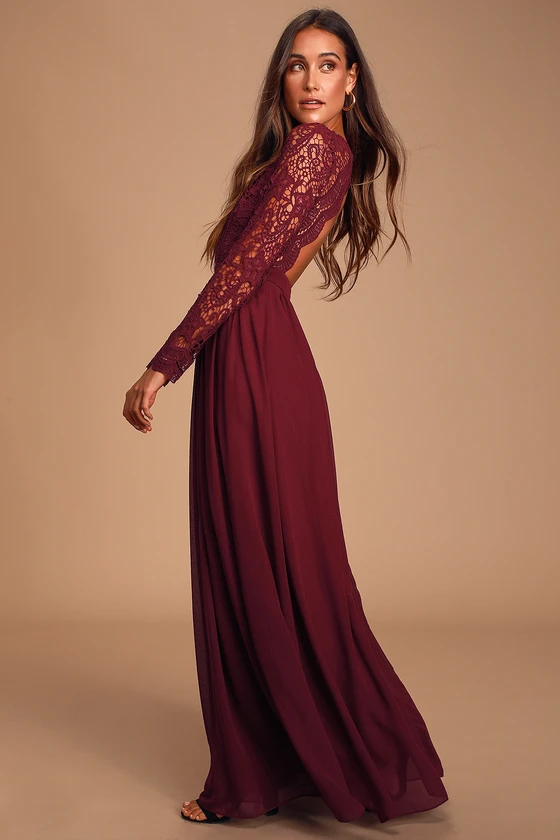 Lulus Exclusive! Open your eyes to a world of beautiful possibilities in the Lulus Awaken My Love Burgundy Long Sleeve Lace Maxi Dress! Crocheted lace elegantly graces the fitted bodice of this stunning dress, with V-neckline and sheer long sleeves. A sexy open back and banded, fitted waist sit above a romantic full length skirt. Hidden back zipper with clasp.
