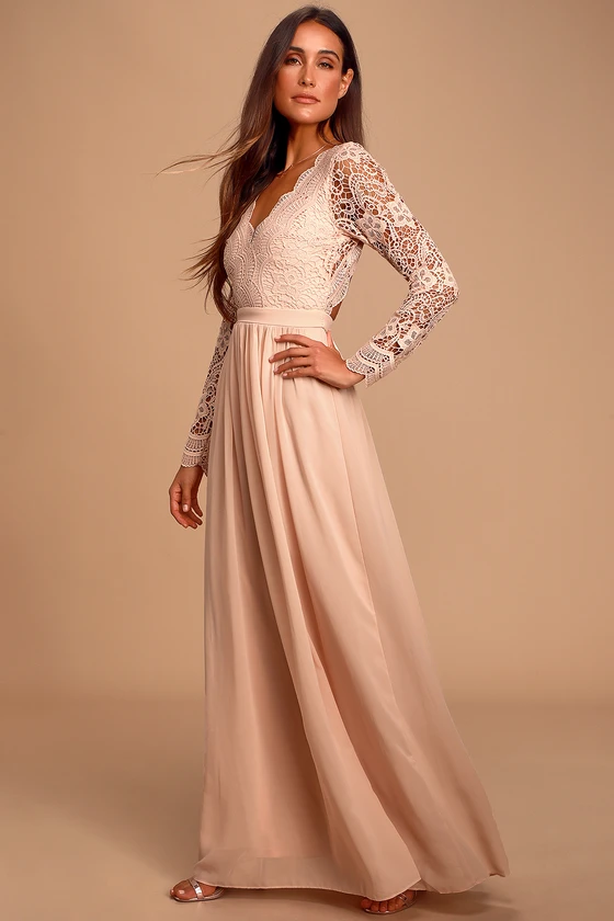 Lulus Exclusive! Open your eyes to a world of beautiful possibilities in the Lulus Awaken My Love Blush Pink Long Sleeve Lace Maxi Dress! Crocheted lace elegantly graces the fitted bodice of this stunning dress, with V-neckline and sheer long sleeves. A sexy open back and banded, fitted waist sit above a romantic full length skirt. Hidden back zipper with clasp.