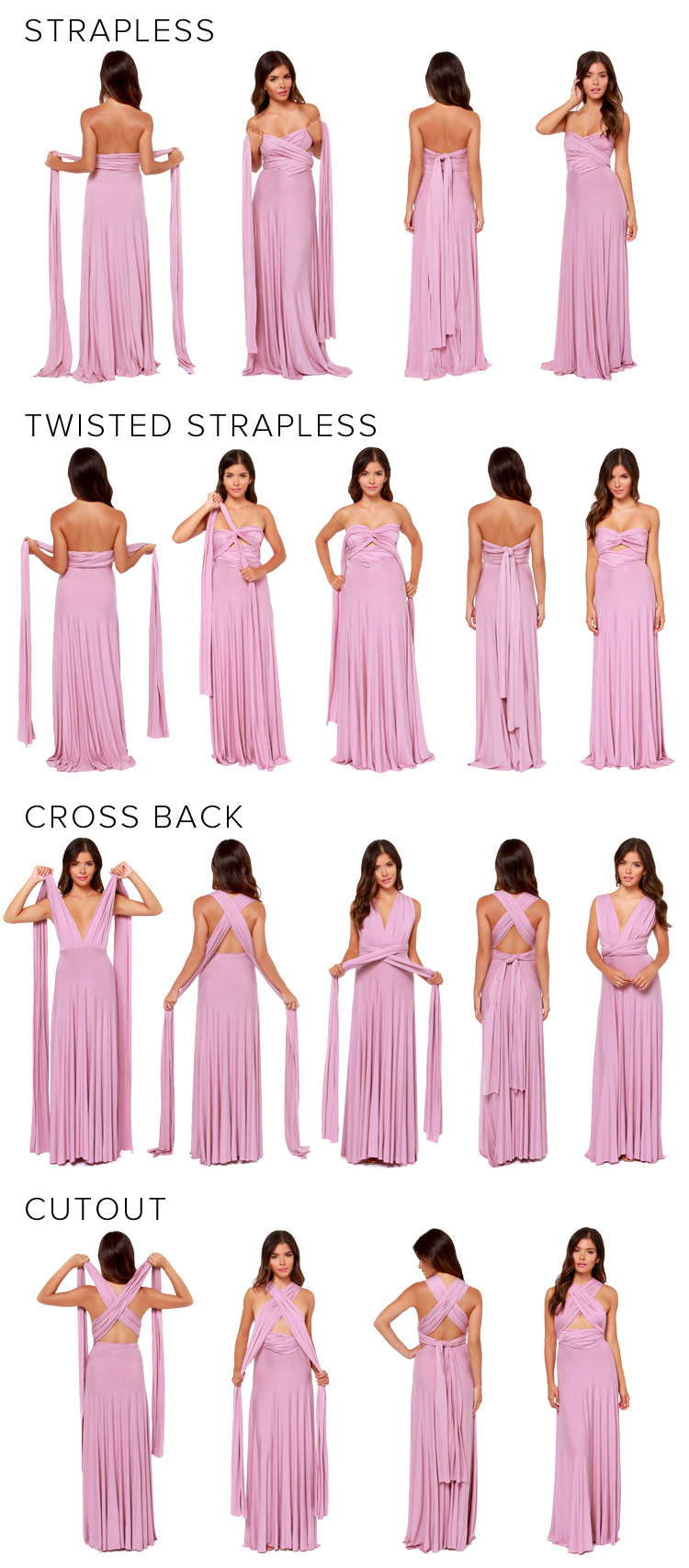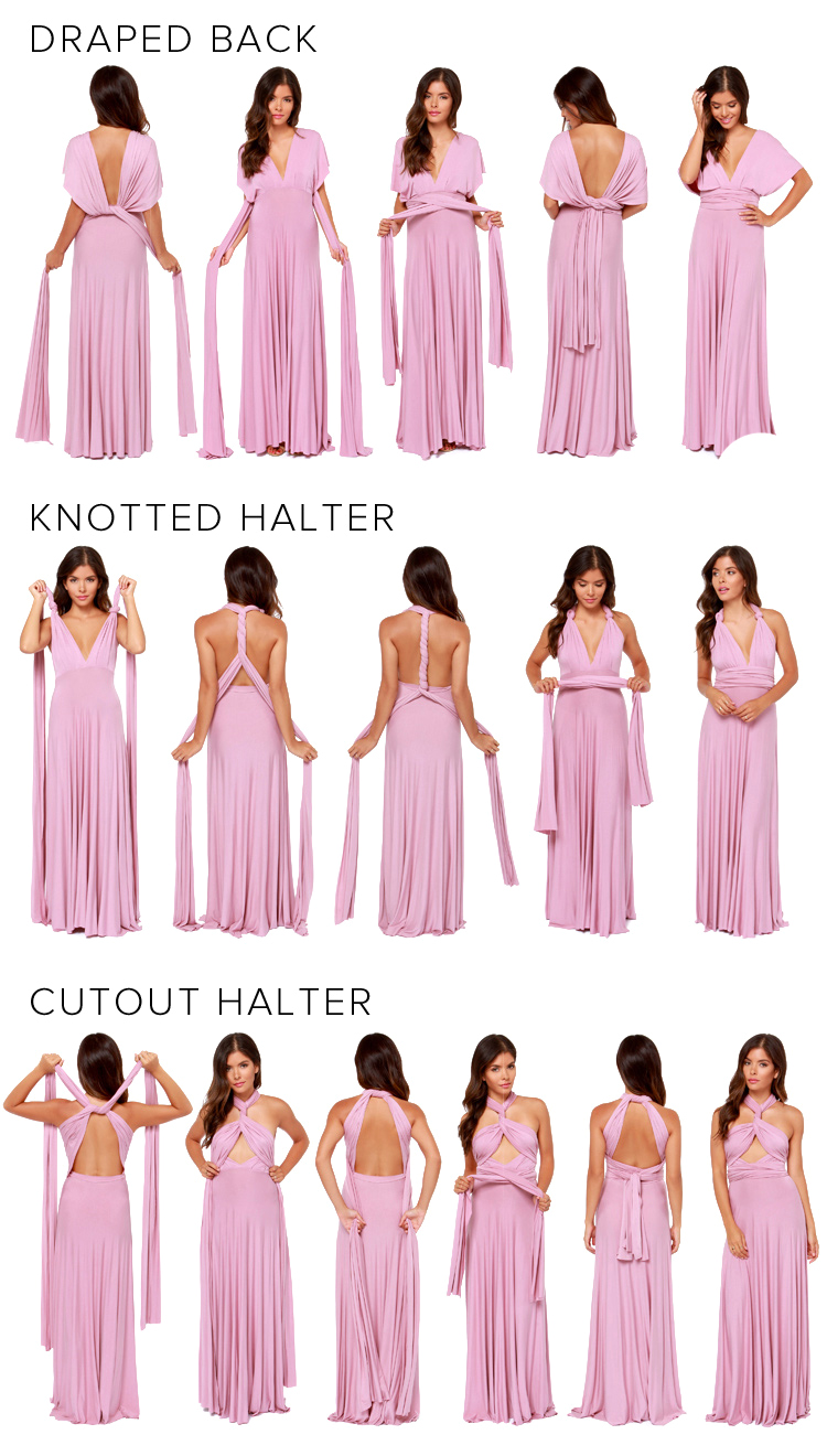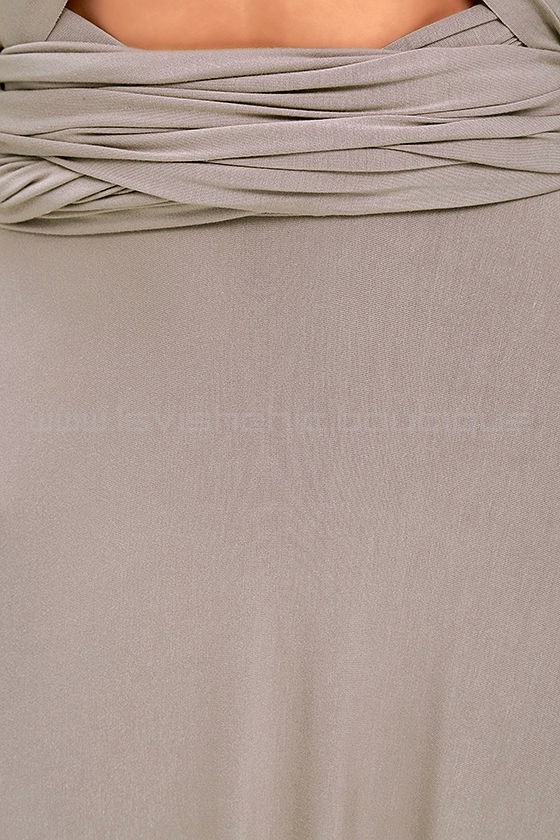 Versatility at its finest, the Tricks of the Trade Taupe Maxi Dress knows a trick or two... or four! Two, 76" long lengths of fabric sprout from an elastic waistband and wrap into a multitude of bodice styles including halter, one-shoulder, cross-front, strapless, and more. Stretchy, jersey knit hugs your curves as you discover new ways to play with this fascinating frock. Full, maxi-length skirt has a raw hemline. Unlined.