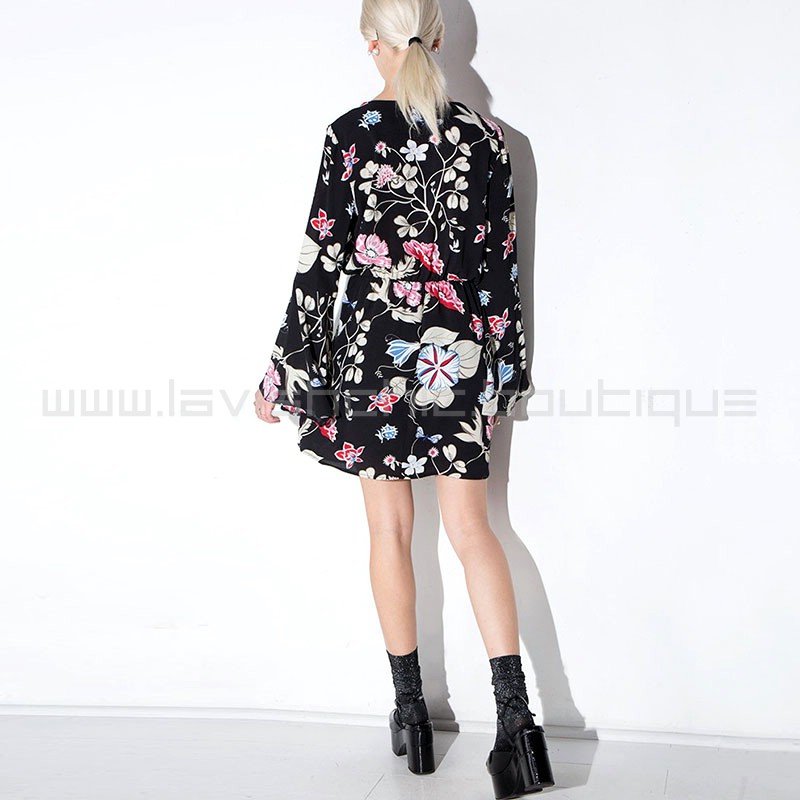 Pretty black floral fit and flare dress with lace up detailing and bell sleeves. Back zip closure. By Glamorous.