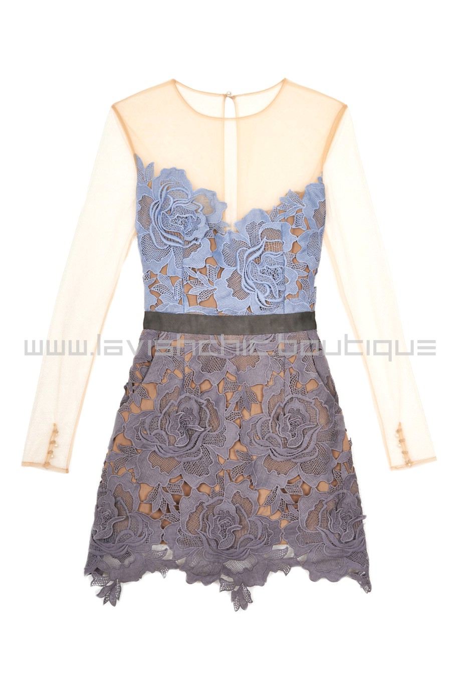 Ethereal tulle panels and long sleeves bring a romantic touch to this lace Self Portrait dress. Grosgrain trim accents the waist, and layered mesh composes the fitted lining. Exposed back zip.
